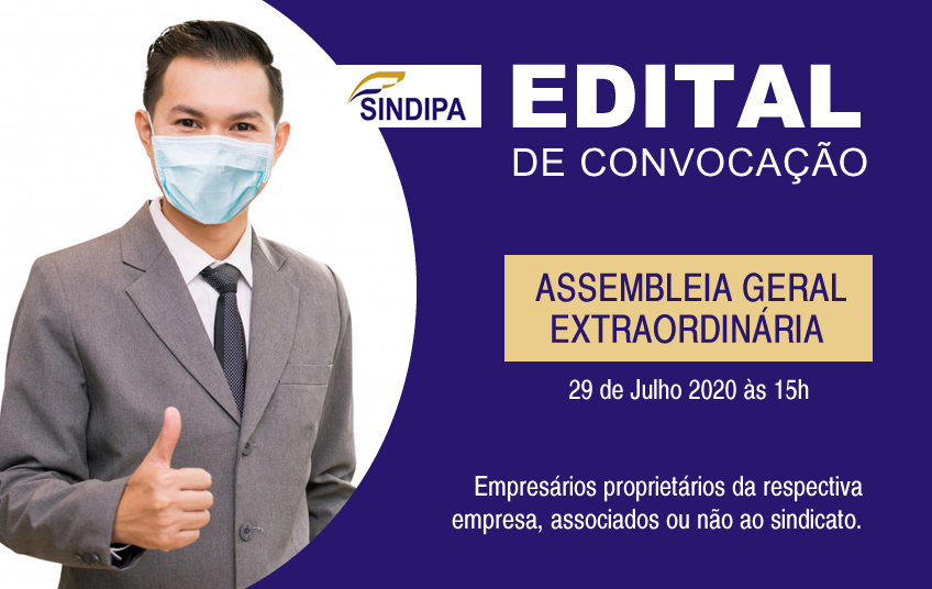 O Presidente do SINDICATO DE HOTEIS, RESTAURANTES, BARES E SIMILARES DE POUSO ALEGRE, CONVOCA todos os empresários do setor de hotéis, restaurantes, bares e similares em geral associados ou não ao sindicato, para uma ASSEMBLEIA GERAL EXTRAORDINÁRIA a ser realizada em primeira convocação as 15.00 h do dia 29 de julho 2.020, na ACIPA (associação do comercio indústria de Pouso Alegre)